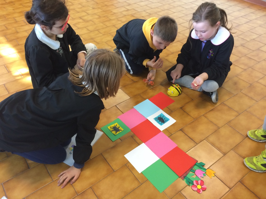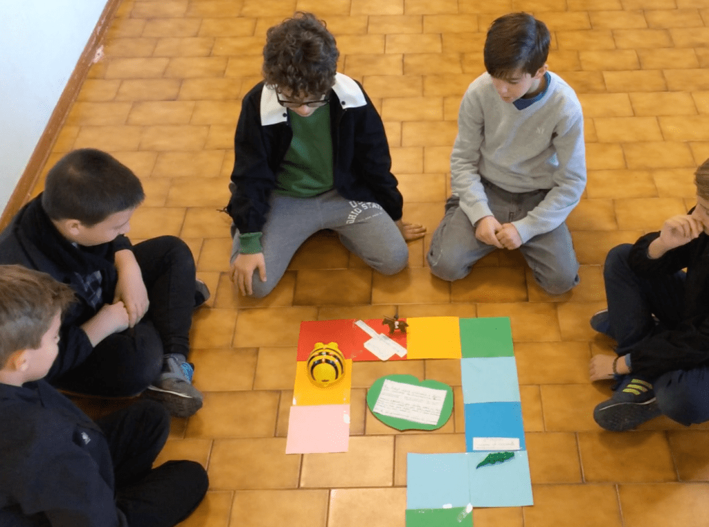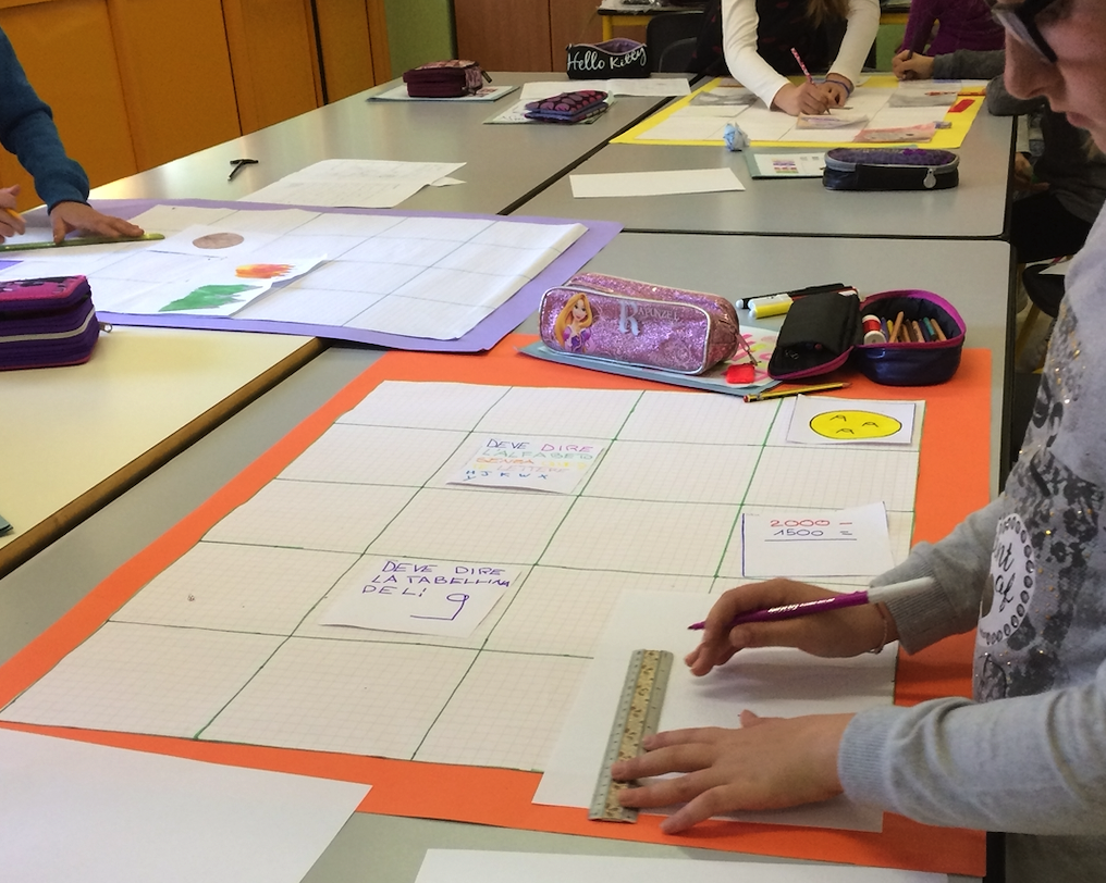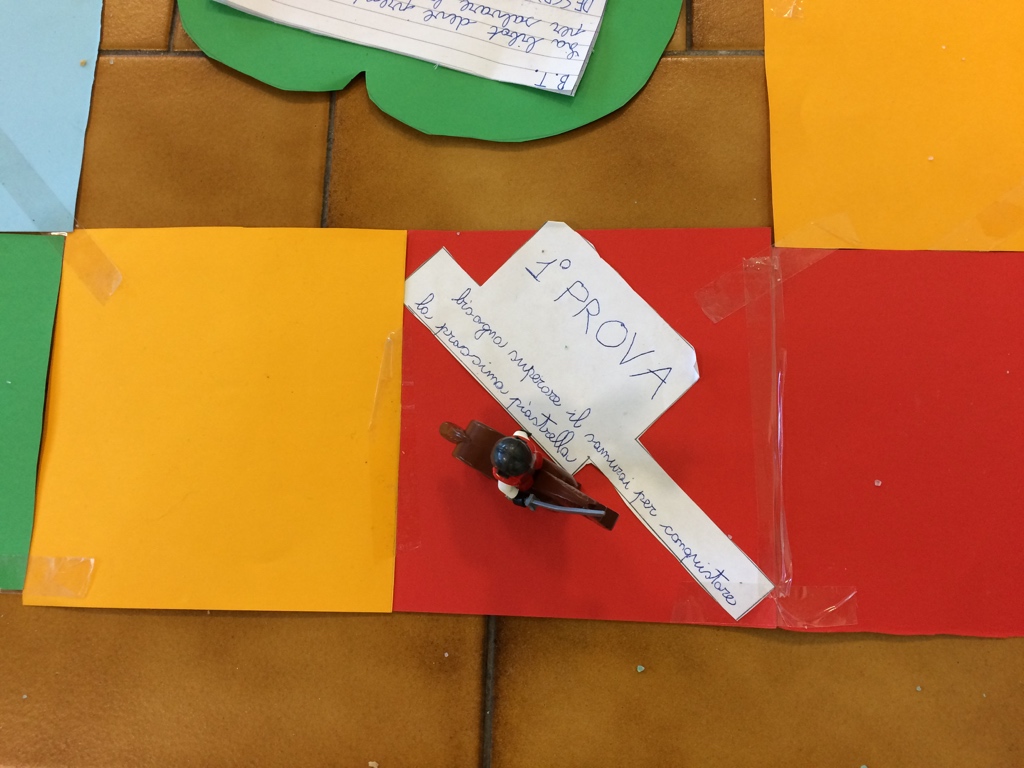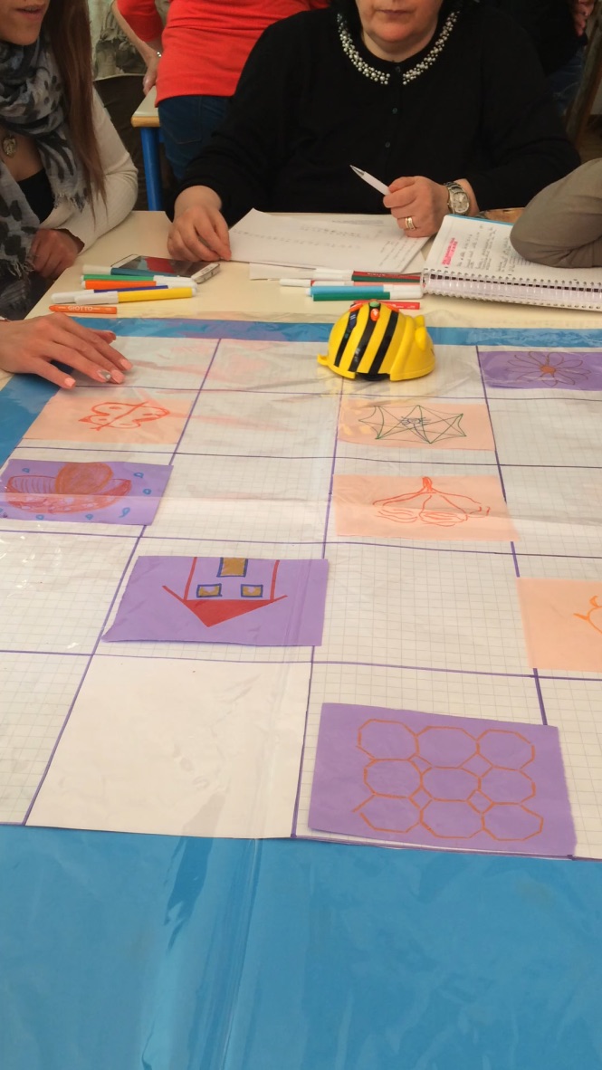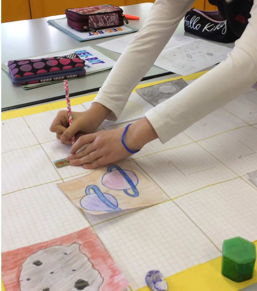 In questa esperienza siamo passati a consegnare ad ogni gruppo un cartoncino Bristol 70×100 ad ogni gruppo di bambini che poi, su un foglio quadrettato ha realizzato la griglia per la Bee Bot.