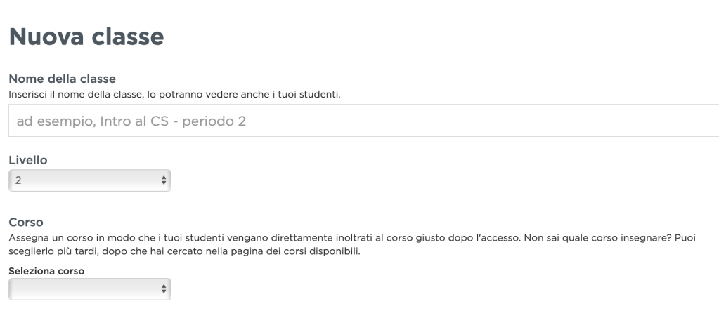 Nome della classe, Livello (che classe è?) e Corso abbinato (consiglio di sceglierlo in un secondo momento)