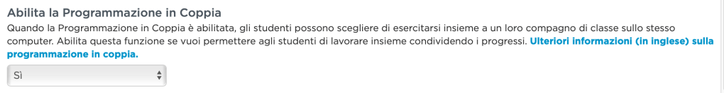E’ anche interessante la funzione Abilita la Programmazione in coppia che permetterà a due studenti di lavorare assieme sullo STESSO COMPUTER. Utile a scuola per la carenza di strumenti…