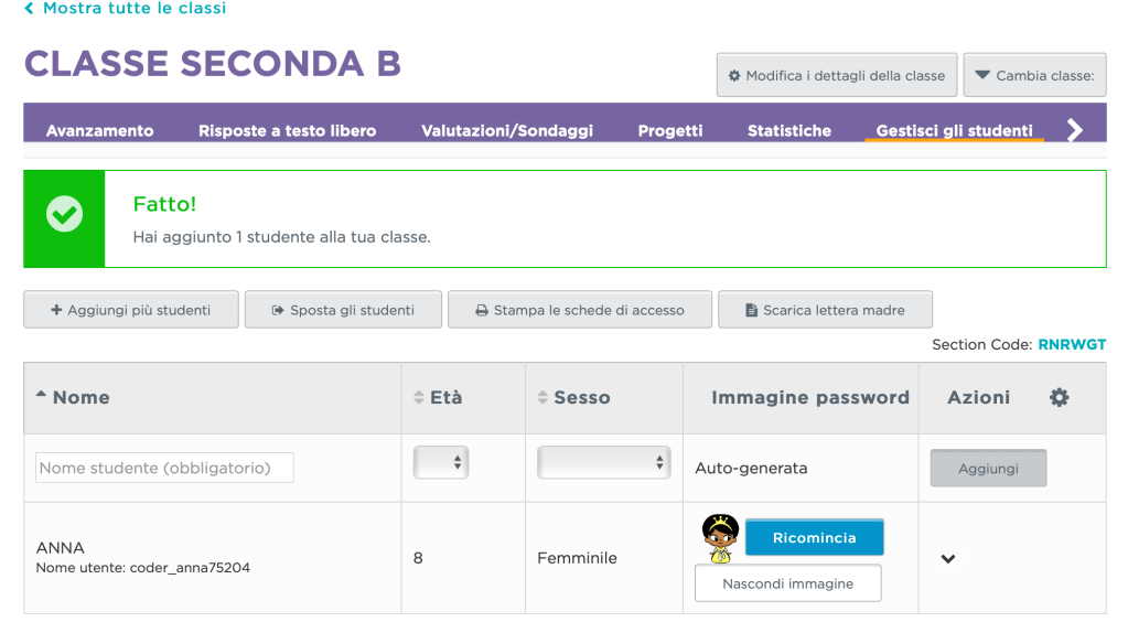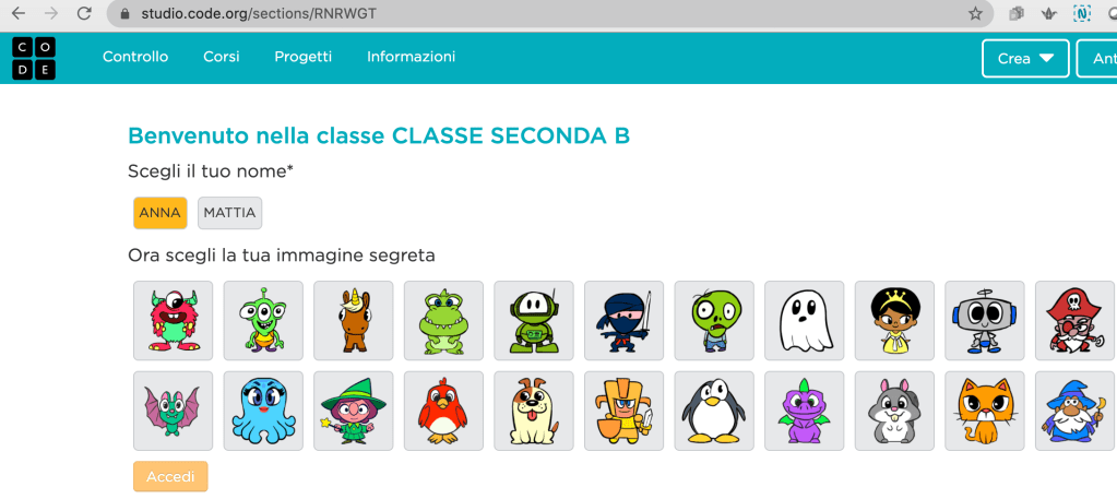 Ai bambini possiamo così dare il codice e loro verranno indirizzati alla pagina della classe dove troveranno il loro nome