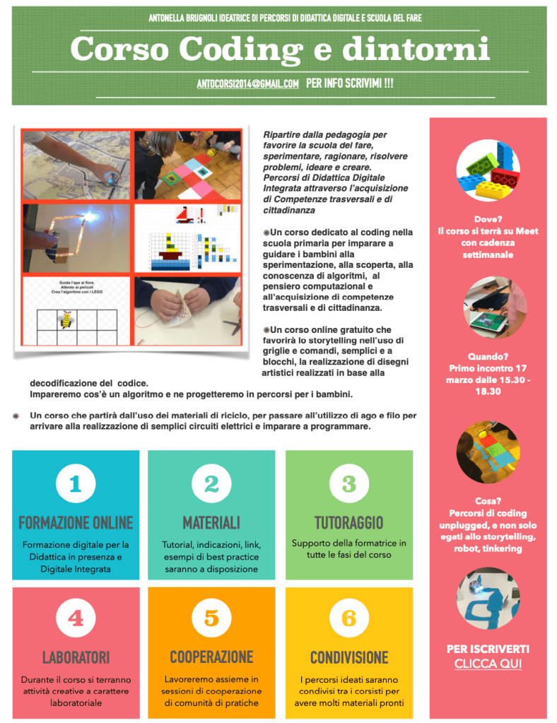 Un corso per imparare a fare coding, anche senza tablet o computer. Imparerai a realizzare percorsi, griglie, giochi e attività da riproporre subito in classe. Un corso coinvolgente che spazierà dagli algoritmi al thinkering, si useranno fogli di carta, colori e righelli, ma anche filo elettrico e batterie, computer e tablet nella parte finale.