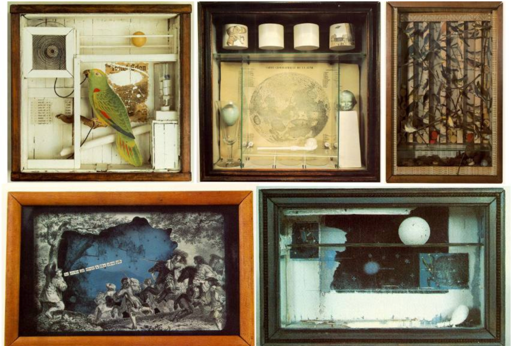 Nel 1932 e nel 1939 tiene le sue prime personali alla Julien Levy Gallery, nelle quali espone numerosi oggetti disparati, molti dei quali sono collocati in scatole. Negli anni quaranta e cinquanta, oltre a varie serie di scatole, Cornell crea le Uccelliere, gli Osservatori, le scatole Medici e quelle dedicate a personaggi del teatro e del cinema.